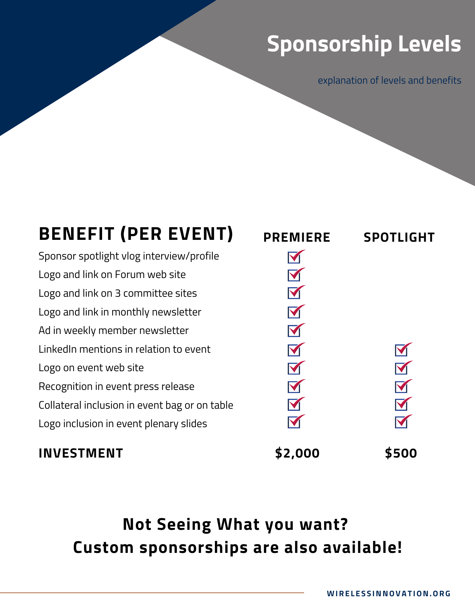 - Our presence on LinkedIn and YouTube will hit an additional 2,000 followers per post. Leading sponsors will be featured in our Video Blog, which is hosted on our YouTube channel and promoted via social media, as well as receive 6 social media promotions per year. Supporting sponsors receive 6 mentions per year and Event sponsors will be included in event promotion posts.